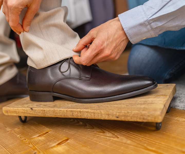 裾の長さはパンツ自体の丈でもあるため、長くなるほど脚が長く見える傾向があります。ただし、長すぎるとだらしない印象を与えてしまうため、基本的には程よいバランスの「ハーフクッション」がおすすめです。自身の体型や靴に合わせて、最適な裾丈のものを選びましょう。例えば股下の長い方であれば、裾が靴に触れない「ノークッション」がおすすめで、脚をすっきりと細く見せる効果が期待できます。一方、裾にたるみのある「ワンクッション」は、一般的な革靴と合わせると脚が短く見える可能性がありますが、厚底の革靴やヒールのある靴を選べば全体のバランスが整い、脚長効果につながります。