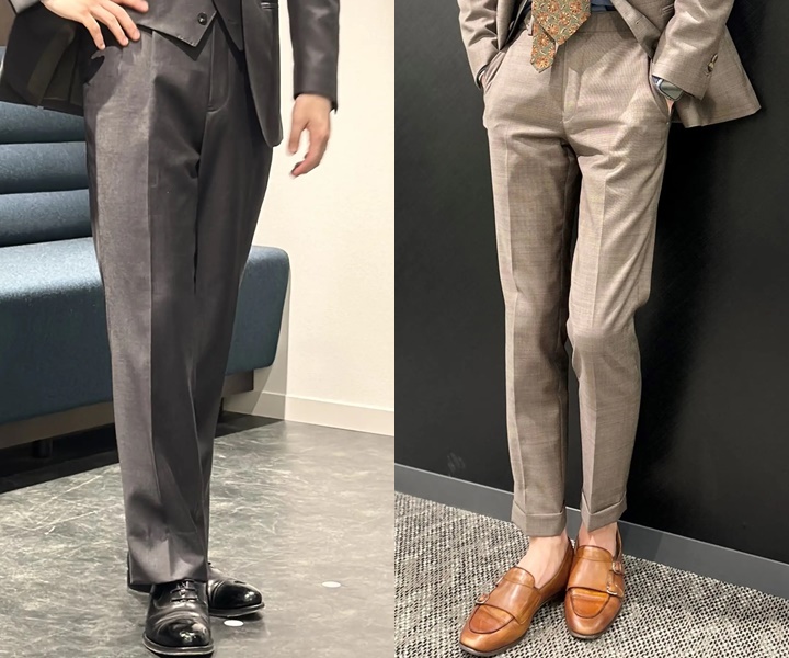 (左:ストレートタイプ、右:テーパードタイプ)▽メンズスーツのパンツの選び方ついて詳しく知りたい方はこちら。