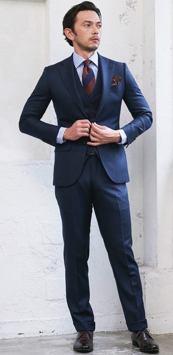 ネイビーカラーは、色の濃淡によって印象が変わり、ビジネススーツの中で最も定番カラーの1つになります。濃い色は、経営者や政治家に好まれ、知的、上品、誠実といった印象に。薄い色は、若々しさやカジュアルな印象になります。ビジネススーツの色選びに迷ったら、ネイビーを選んでおくといいでしょう。