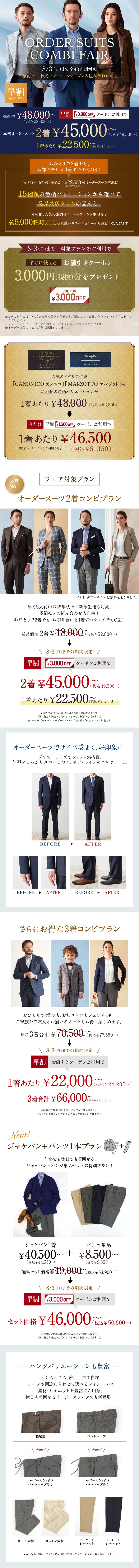 ▶本格オーダースーツ2着¥46,000~(税込¥50,600~)