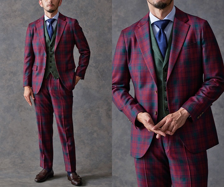 レッドを基調にグリーンが入ったタータンチェックスーツは、華やかな場面にぴったりです。グリーンのベストを合わせたオッドベストスタイルがアクセントとなり、立体感と洒落感を演出します。シャツとネクタイをブルーの無地で引き締めることで、スーツの鮮やかな柄を引き立てつつも派手すぎない調和のとれた印象に。着る人の個性を強く印象付ける、パーティーシーンにぴったりのコーディネートです。またジャケットとパンツはそれぞれ単品での着用もおすすめです。