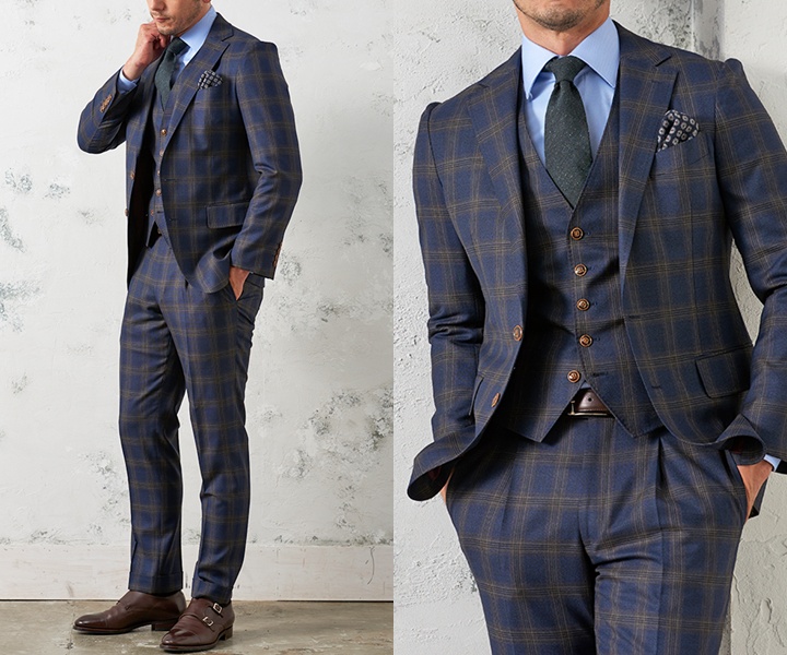 ネイビーをベースにイエローが入ったタータンチェックスーツは、華やかさと落ち着きを兼ね備えた印象でビジネスシーンにおすすめです。スリーピーススタイルで着用することでフォーマル感や重厚感が加わり、より上品な雰囲気に仕上がります。またサックスブルーのシャツとダークグリーンのネクタイを合わせることで、知的で誠実な印象に。程よい存在感がありつつも上品に決まるので、ビジネスシーンでも安心して着用できます。