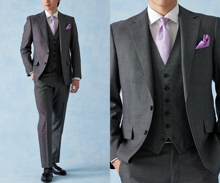 落ち着きのあるグレースーツに、淡いラベンダーのネクタイとチーフを合わせた華やかなコーディネートです。シンプルながらも上品さのあるスーツに、ラベンダーカラーが柔らかい印象を添え、お宮参りという特別な一日を穏やかに演出しています。程よい軽やかさのある印象で、春夏シーズンの参拝にぴったりの着こなしです。