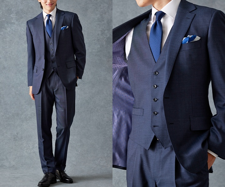 深みのあるネイビーのスリーピーススーツは、お宮参りにふさわしい清潔感と誠実さを演出します。さりげない光沢感と深みのある色合いが上品で、フォーマルな場にぴったりです。ブルーのネクタイとチーフが爽やかなアクセントとなり、家族の記念日を華やかに彩ります。上品で落ち着いた雰囲気の中に、温かみを感じさせるスタイルです。
