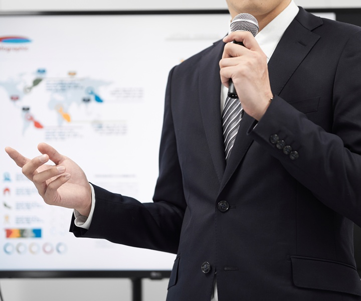 講演では会場内の多くの人の視線を浴びるため、存在感や華やかさのあるスーツスタイルが望ましいです。