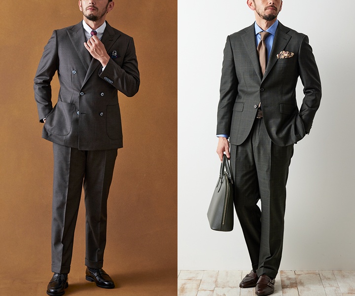 スーツカラーは定番のネイビーやグレーに加え、ダークブラウンやダークグリーンなどの深みのある色もおすすめで、50代の包容力が引き立ちます。また、シングルスーツだけでなく、重厚感のあるダブルスーツも選択肢として有効です。