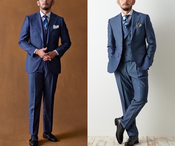 スーツカラーは誠実さ信頼感を与える、ブルーやブルーグレーが良いでしょう。ぱっと目を引くような発色の良い色合いを選ぶと、周りとの差別化を図れ注目度も高まります。また、上品な光沢感がある素材や少し明るめのトーンのネイビーやグレーもおすすめです。柄は主張が控えめな無地またはストライプで、50代らしい品格や存在感を与えることを意識しましょう。