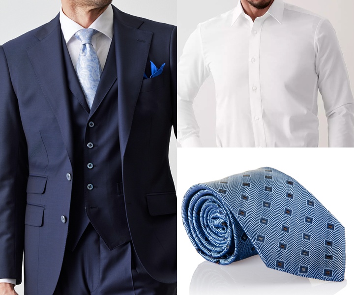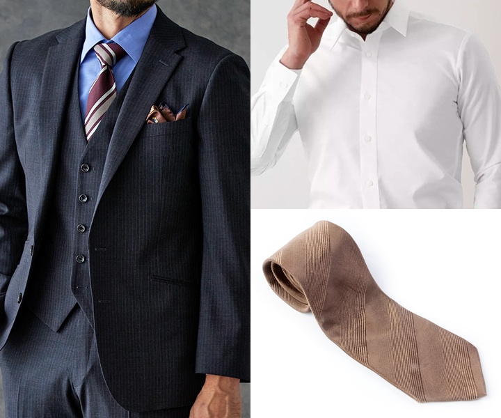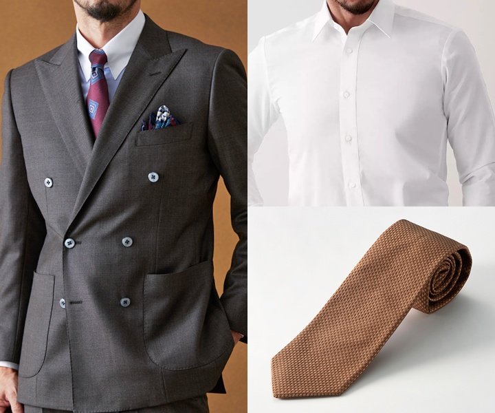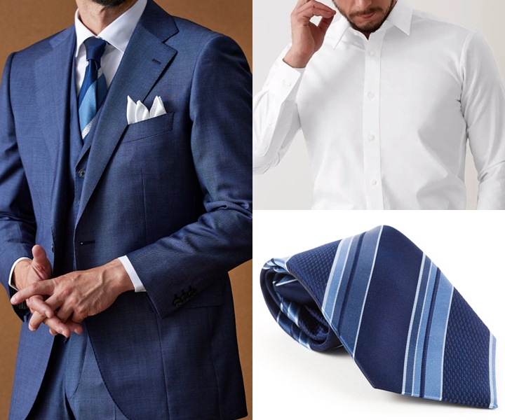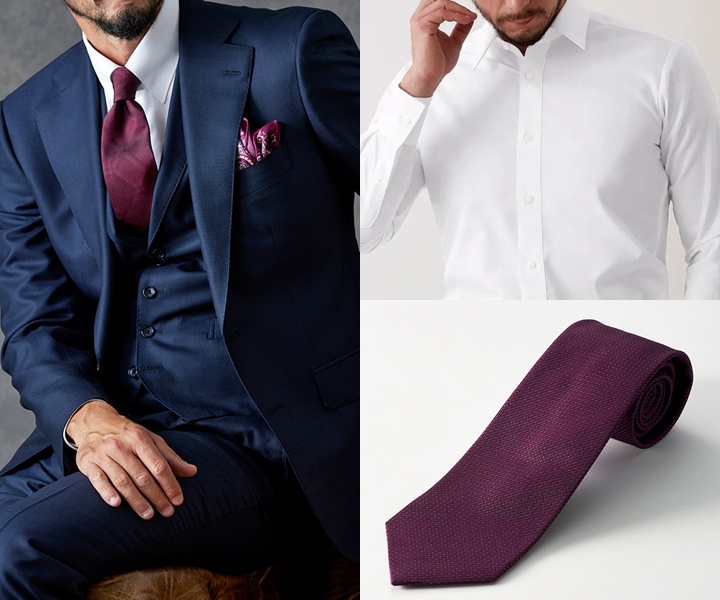 シャツは白やサックスブルーのドビー柄(上品な光沢感が特徴の細かい織り柄)を合わせると、清潔感や知性を強調することができます。ネクタイはボルドーなど力強さを感じさせる色の無地を採用することで、締まりのある表情に仕上がり、自然と聞き手を引き込むコーディネートが完成します。