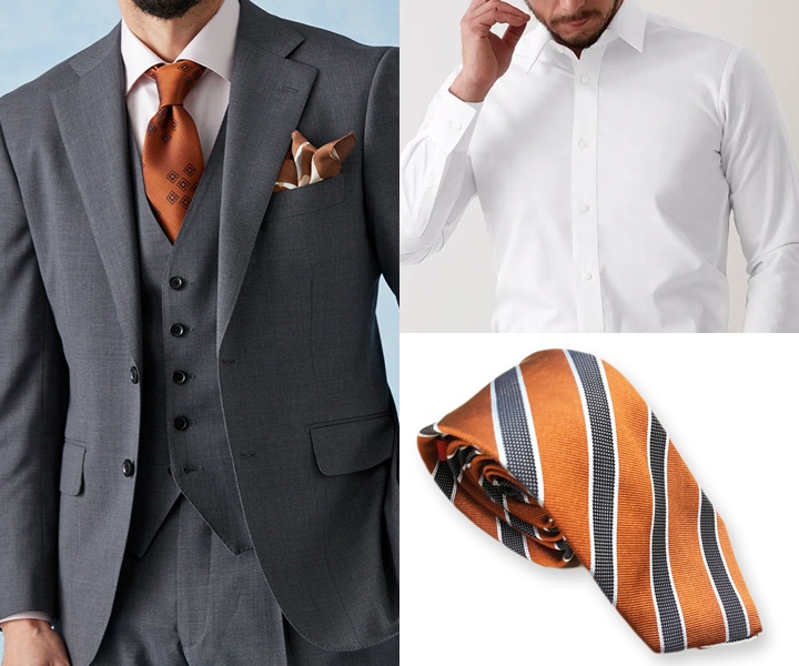 シャツは白やサックスブルーのドビー柄で清潔感を演出すると好印象です。ネクタイはイエローやオレンジなどで明るさや親しみやすさを取り入れると、相手との距離感も自然と縮まるでしょう。柔らかい色使いを意識することで、50代ならではの包容力が伝わり、接待や会食にふさわしい心地よい雰囲気を作り出します。