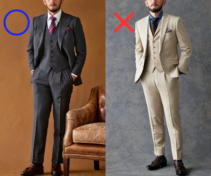 (左:チャコールグレー・ストライプスーツ、右:ベージュスーツ)2.テーパードシルエットのパンツを選ぶ