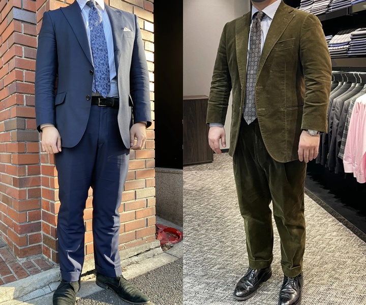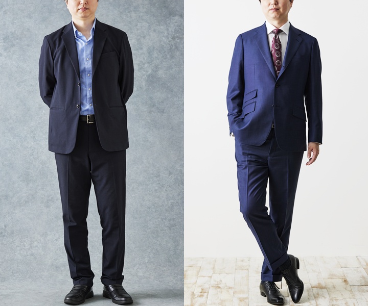 (左:既製スーツ、右:オーダースーツ)オーダースーツ専門店グローバルスタイルでは、5,000種類以上の生地と豊富なモデルから、一人ひとりの体型や好みに合ったスーツをお仕立てします。ジャストサイズのスーツは、着心地が良いだけでなく、好印象を持ってもらえるでしょう。
