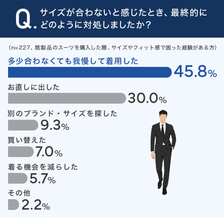 最も多かったのは「多少合わなくても我慢して着用した」で45.8%となりました。次いで、「お直しに出した」が30.0%となり、既製スーツではサイズ感が合わず最終的にはプロの手を借りてフィット感を整える方も一定数いるという結果になりました。