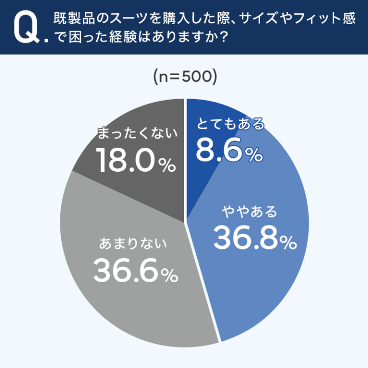 「とてもある」と回答した人が8.6%、「ややある」が36.8%となり、合わせて45.4%の方がサイズやフィット感で困った経験があるという結果になりました。約半数近くの方が、既製スーツに何らかの違和感を抱えている事態が明らかになりました。