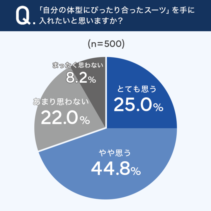 「とても思う」が25.0%、「やや思う」が44.8%となり、合わせて69.8%が体型にぴったり合ったスーツを求めているといった結果になりました。「あまり思わない」は22.0%、「まったく思わない」は8.2%となり、約3割は現状に満足しているようです。