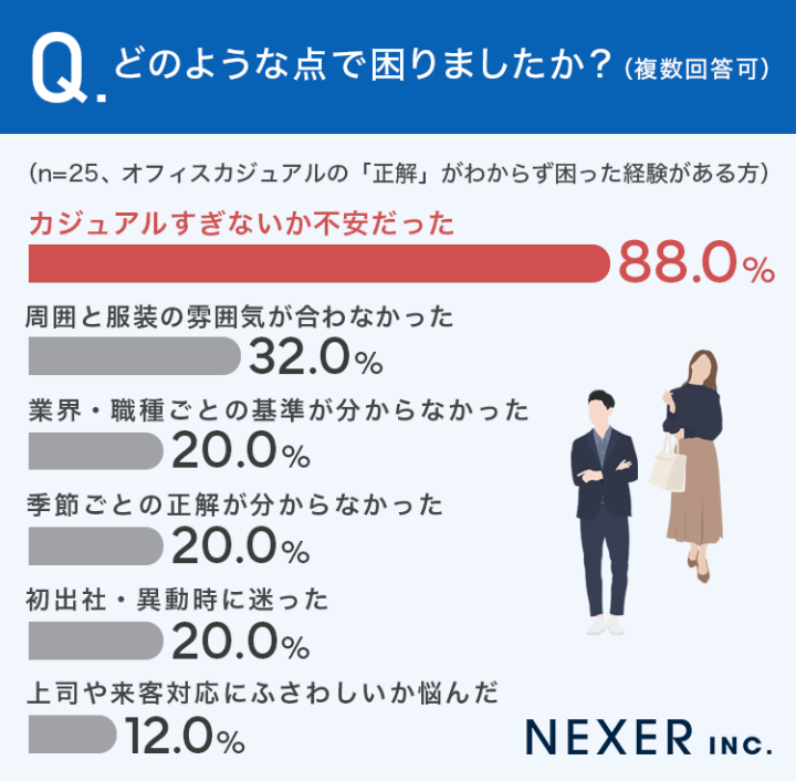 最も多かった回答は「カジュアルすぎないか不安だった」で88.0%となりました。次いで、「周囲と服装の雰囲気が合わなかった」が32.0%、「業界・職種ごとの基準が分からなかった」「季節ごとの正解が分からなかった」「初出社・異動時に迷った」はいずれも20.0%と続きました。判断の基準が曖昧なため、多くの方が迷いやすい傾向にあります。