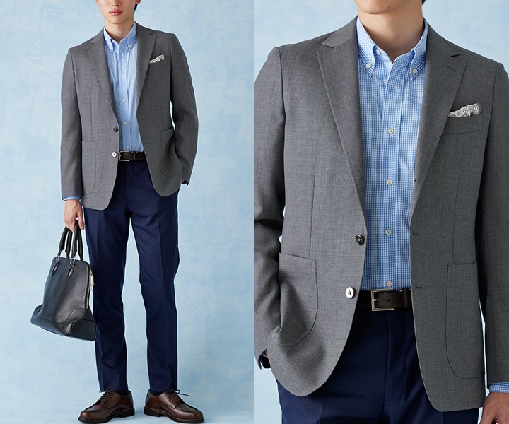 落ち着いたグレージャケットに、シンプルで飽きのこないネイビーパンツコーデ。ジャケットはスタンダードなノッチドラペルを採用し、初出社や異動日にも適した端正なデザインになります。爽やかな印象を与える、オフィスカジュアルにふさわしい着こなしです。