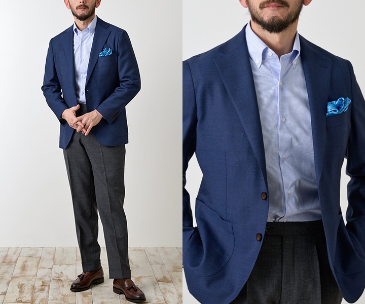 上品さと落ち着きを演出するネイビージャケットに、清潔感のあるグレーパンツコーデ。ジャケットと同系色のポケットチーフがアクセントとなり、オフィスカジュアルにふさわしい着こなしとなります。程よい抜け感と大人の余裕を感じさせるジャケパンスタイルです。