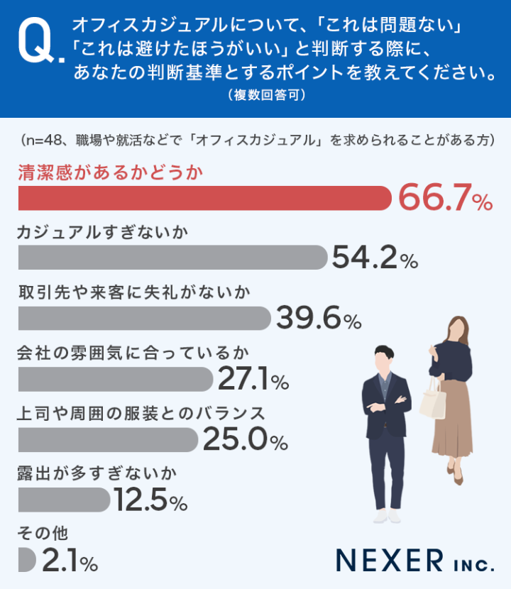 最も多かった回答は「清潔感があるかどうか」で66.7%となりました。次いで「カジュアルすぎないか」が54.2%、「取引先や来客に失礼がないか」が39.6%という結果に。服装の合わせ方に迷った場合でも、清潔感が保たれていれば大きく外すことはありません。迷った際は、清潔に見えるかどうかを基準にするのが安心です。