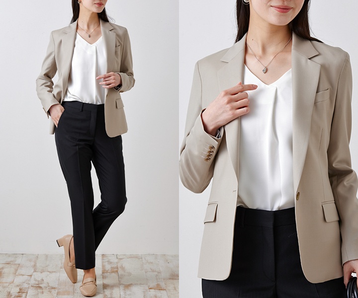 知的で女性らしい印象のベージュジャケットに、シックなブラックパンツコーデ。ブラックのパンツを合わせることで、ベージュジャケットの柔らかさにメリハリを与えます。ベーシックカラーでまとめた、オフィスカジュアルに最適なきちんと感のある着こなしです。