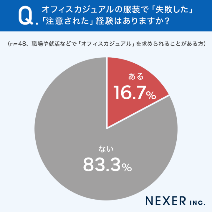 16.7%が「オフィスカジュアルの服装で「失敗した」「注意された」経験あり」