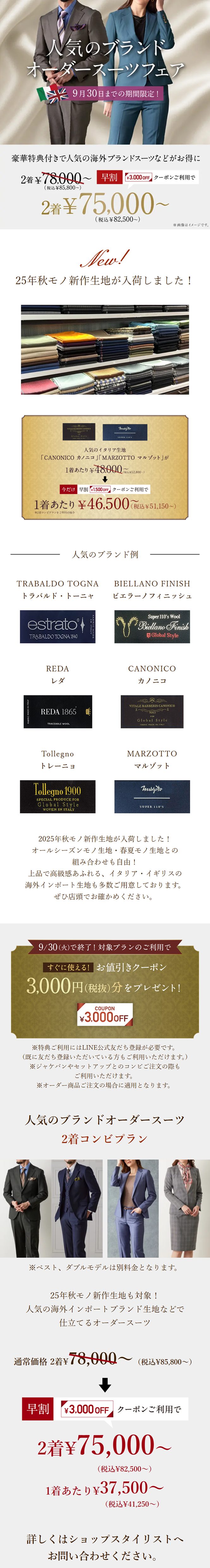 ▶人気ブランドの生地を使用したオーダースーツがまとめ買いでお得に