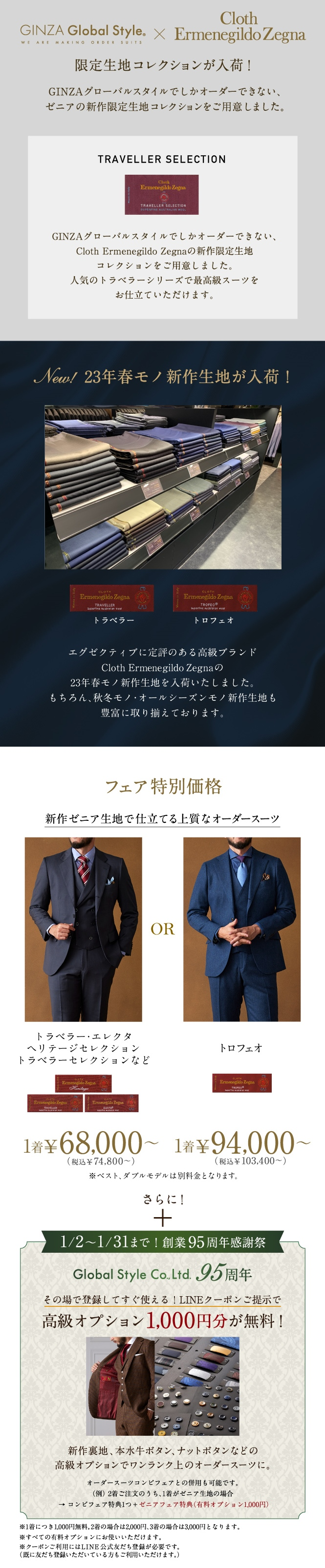 ■ 関連ページ:【2023年1月】「グローバルスタイル」早くもゼニア生地の春モノ新作が!?