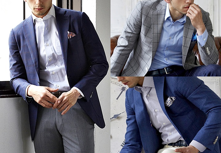ジャケットの定番は“ネイビー”。グレー系・紺系・茶色系など、様々なカラーパンツと合わせやすいのも人気の理由です。オーダージャケットなど細めのシルエット、身体に合ったサイズ感のジャケットを選びスッキリと見せると良いでしょう。カジュアルな服装でも問題のない場合は、チェック柄のジャケットや素材感のあるジャケットで他の人と差をつける楽しみ方もあります。