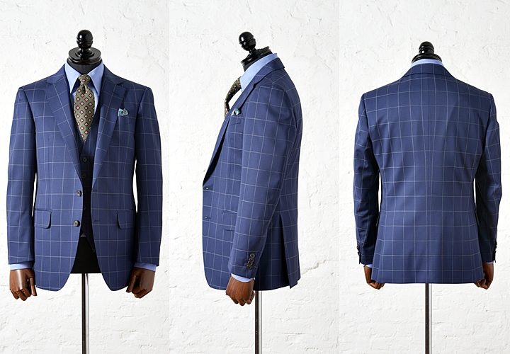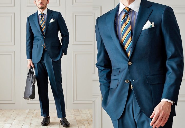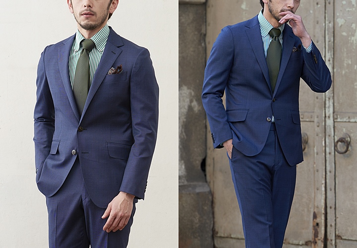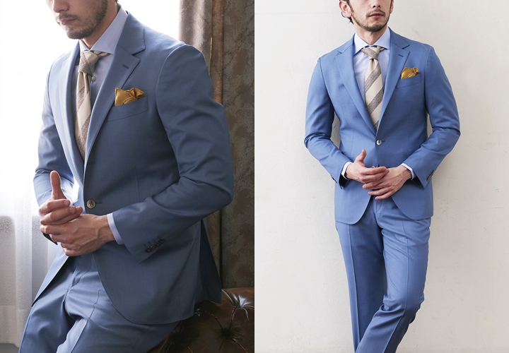 明るめのブルーに程よい大きさの水色のチェック柄を差した、春夏シーズンの生地になります。ペイズリー柄の裏地をチョイスし、上品さとエレガントさをプラス。アイテムは青系にそろえることでスーツの柄を馴染ませつつ、爽やかさをより一層演出できます。青系は、基本明るい色合いが多くなります。