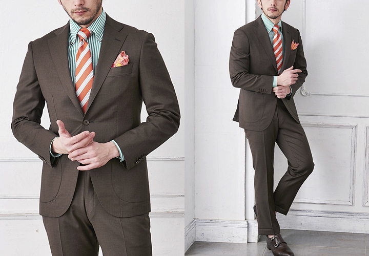 カーキ系は、なかなかビジネス用としては難しい色合い、オシャレに寄せダブルスーツで決めるのありです。