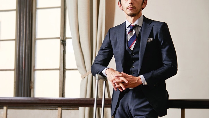 襟付きベストのスリーピーススーツは、エレガントな表情に。裏地にこだわるのも良いでしょう。