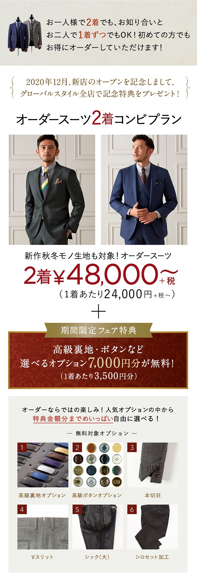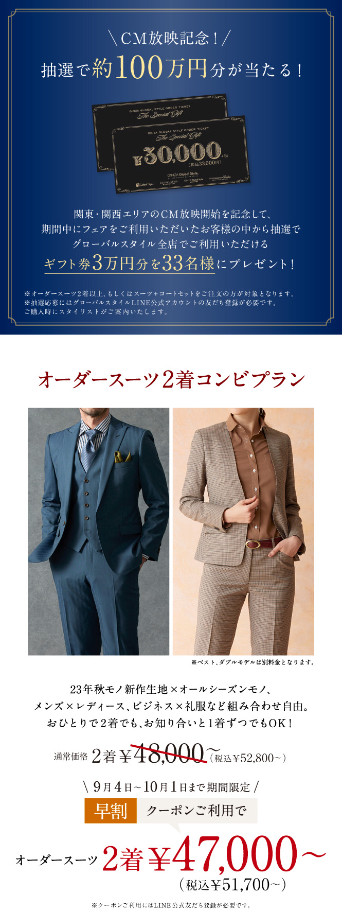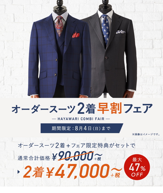 ▶本格オーダースーツ2着¥46,000~(税込¥50,600~)