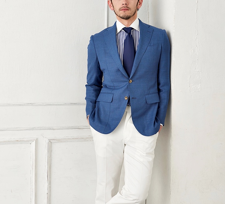 近年では、カジュアルなジャケパンスタイルの定着と共に、夏のビジネスシーンを快適に過ごすための正装として欠かせない“クールビズ”スタイル。白シャツでもいいのですが、より爽やかな青系のシャツは、清涼感をコーディネートに追加してくれます。