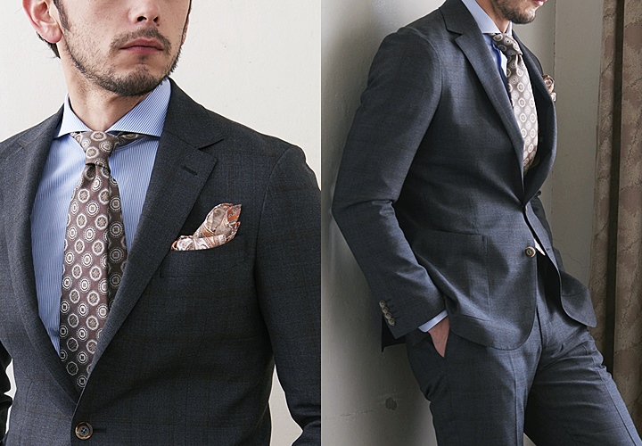 オフィスカジュアルが推奨されている企業などでは、青シャツのデザインと共に、色柄で魅せるスタイルがオススメです。最近では、ブラウン・ベージュ・カーキなど、スーツカラーの幅も広がっています。