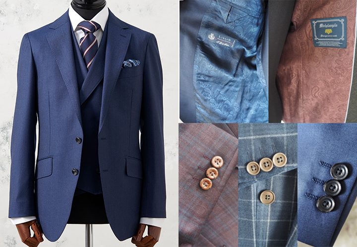 多くの種類のボタン・裏地の中から好きなものを選びます。裏地は少し派手にして上着を脱いだ時にだけチラっと見える…なんて、ワンランク上のお洒落を楽しむのが人気の様子。さらに、ポケットなどのディティールにもこだわれます。