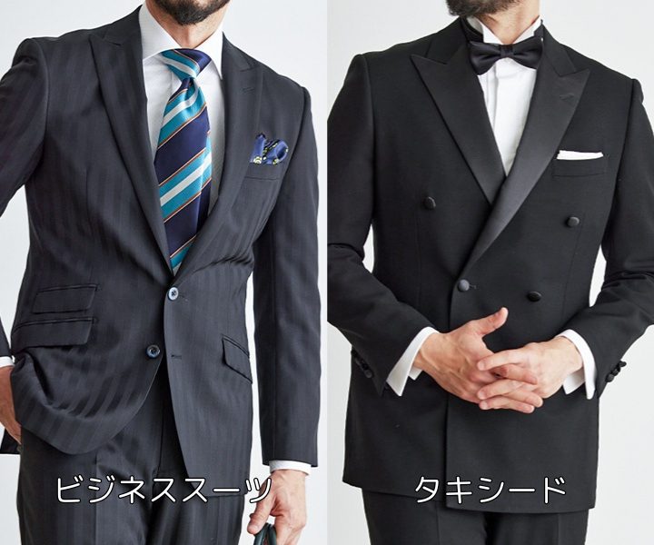 タキシードは、通常のビジネススーツより濃い黒(真っ黒)な生地、「タキシードクロス」と呼ばれる生地を使用しています。タキシードクロスとは、縦糸に梳毛糸、横糸に紡毛糸を使って綾織にした毛羽のないフォーマル用服地のことです。黒の中でも色が濃く、滑らかな生地で光沢感のある軽さが特徴です。ビジネス用のスーツは少しグレーがかった黒になるため、屋外など明るいところに出ると違いがよく分かります。