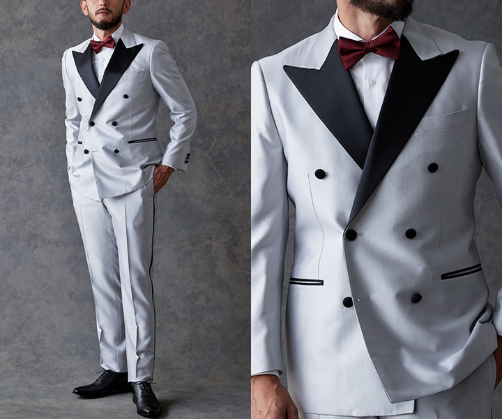 黒のピークドラペルが映えるダブルブレストを採用した、シルバーのタキシードスタイルです。シャープなコントラストがシルエットを際立たせ、クラシックな雰囲気を演出します。さらに深みのあるボルドーの蝶ネクタイが加わることで、華やかさと大人の落ち着きを兼ね備えたスタイルに仕上がります。存在感のある着こなしなので、結婚式をより華やかに彩ってくれるでしょう。