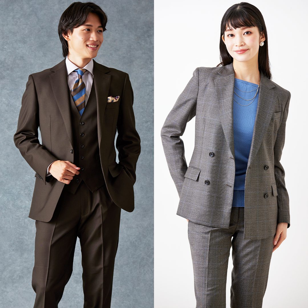 暖色系で温かみを感じられるブラウンカラーは他のカラーに比べてユニークな着こなしができ、個性を表現したい方におすすめです。プライベートに人気のカラーですが、ビジネスシーンでも着こなせる生地が年々多く入荷しています。