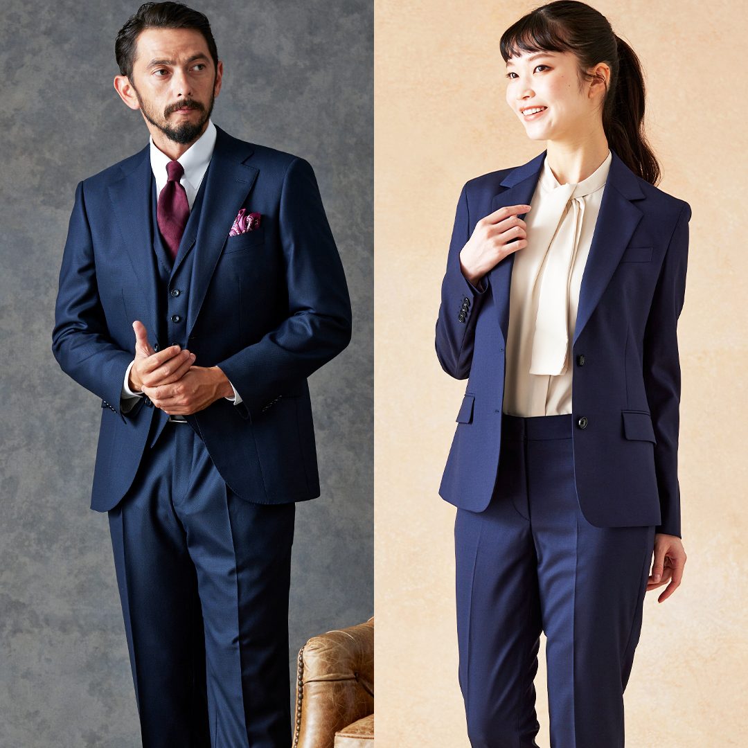 王道のネイビーカラーにシンプルな無地の組み合わせが大人気。無地だからこそ、上質な生地を選ぶことでワンランク上の着こなしに。25年冬モノ新作では、ツヤ感の美しさが魅力的な生地やストレッチ生地までご用意。