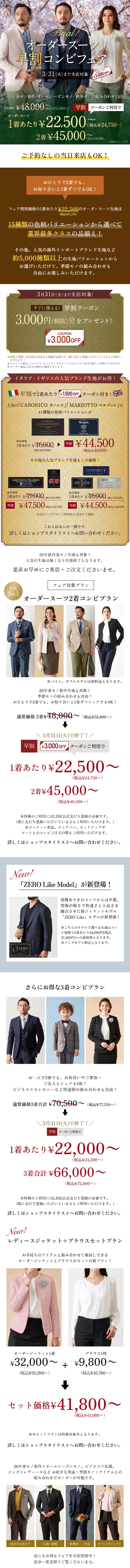 《当日来店OK!》3,000円分の豪華早割クーポン付!オーダースーツ1着2万円台~