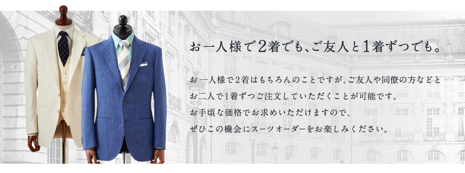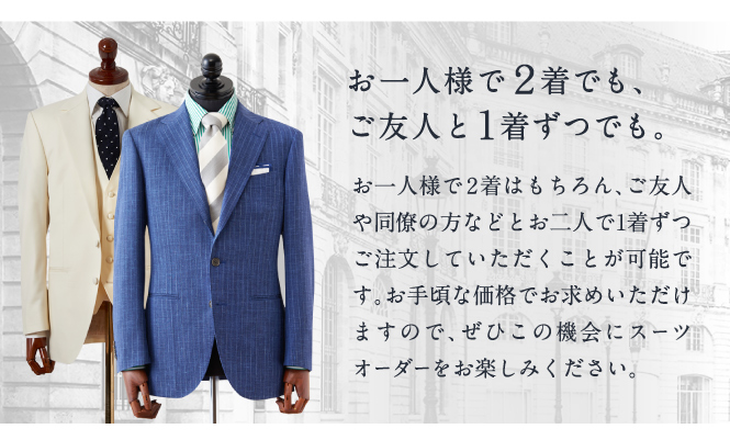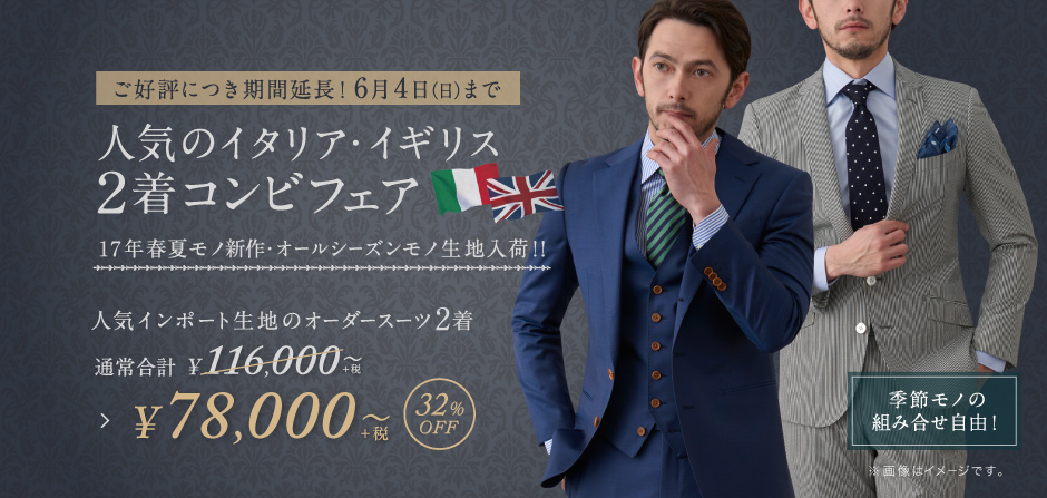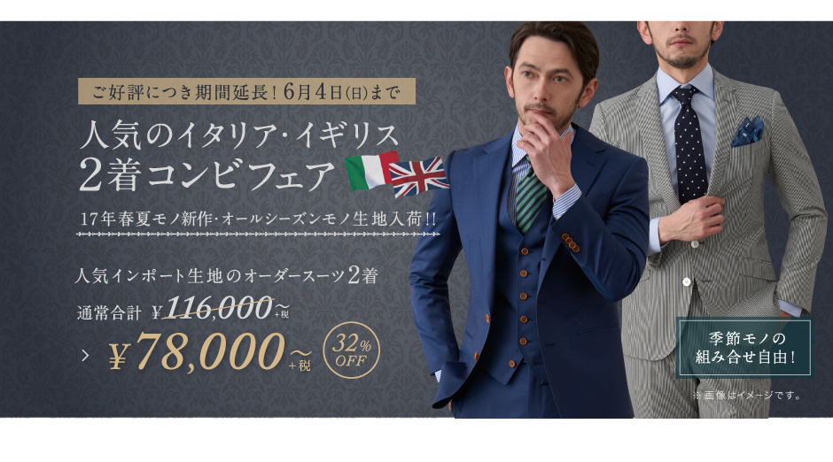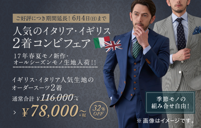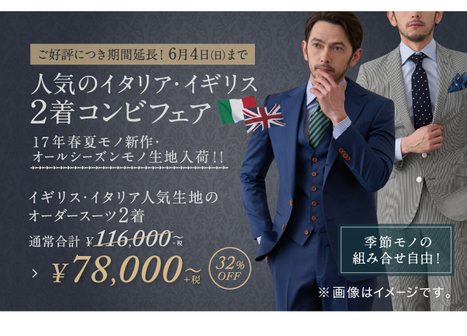 【ご好評につき期間延長!】人気のイタリア・イギリス生地のオーダースーツが2着で78,000円〜