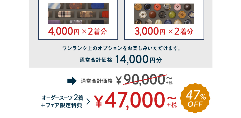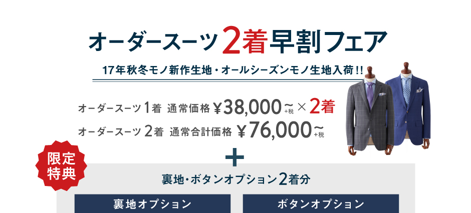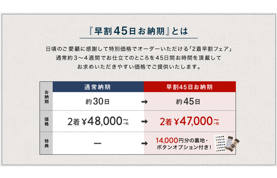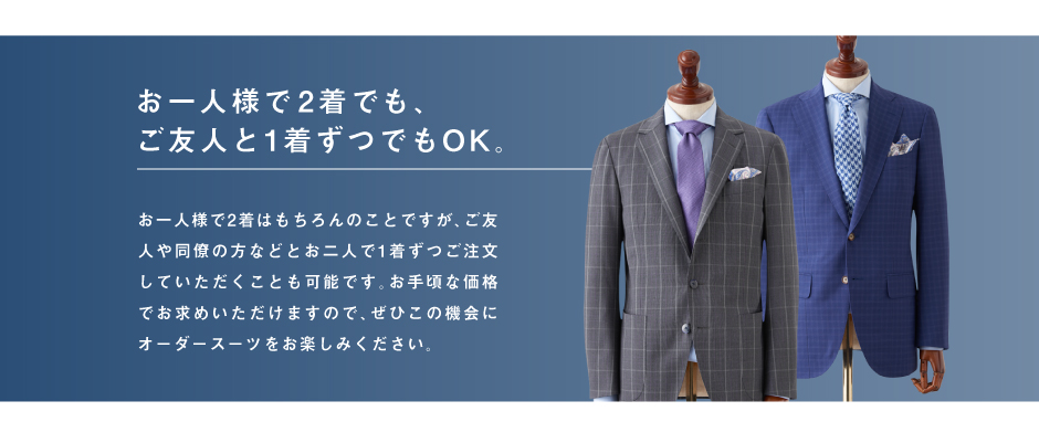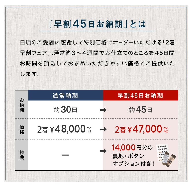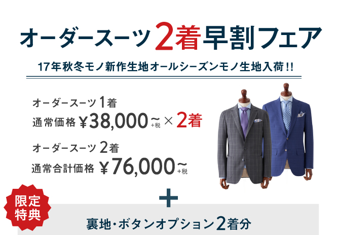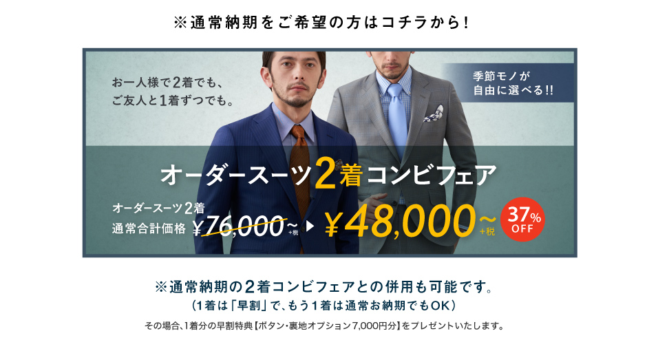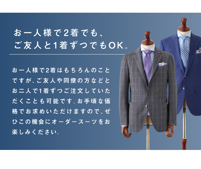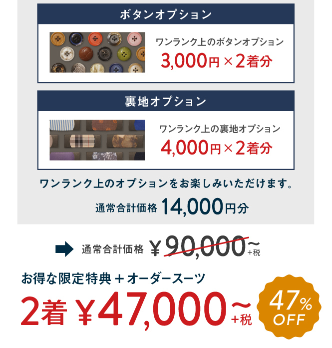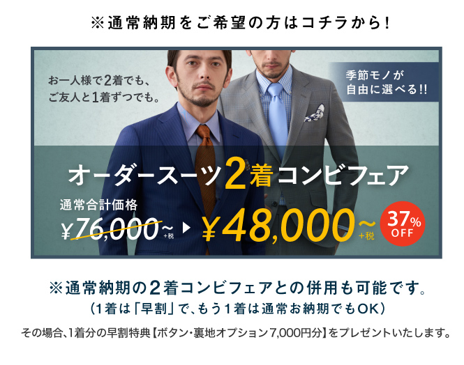 【早割】オーダースーツ2着47,000円~ 今だけ14,000円分の限定特典付き!
