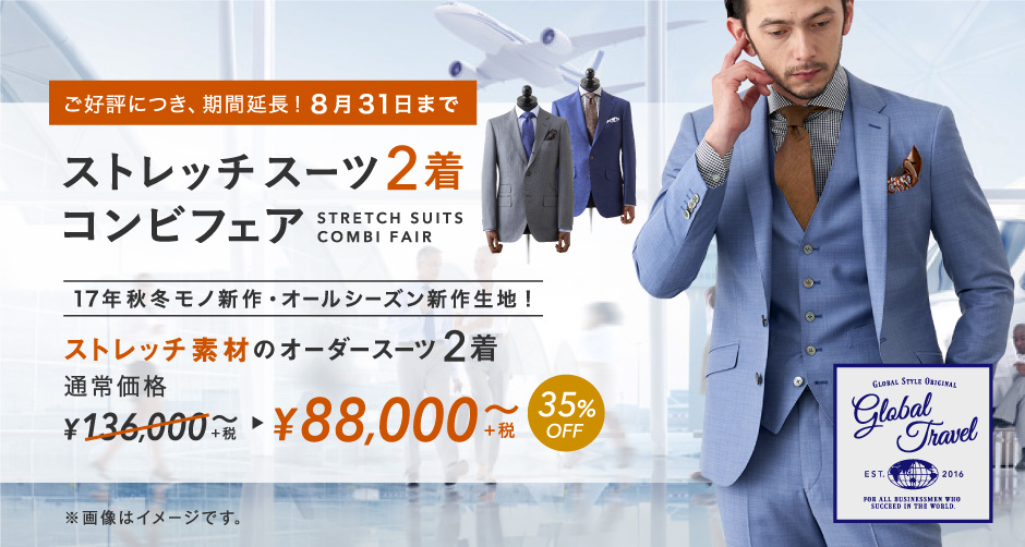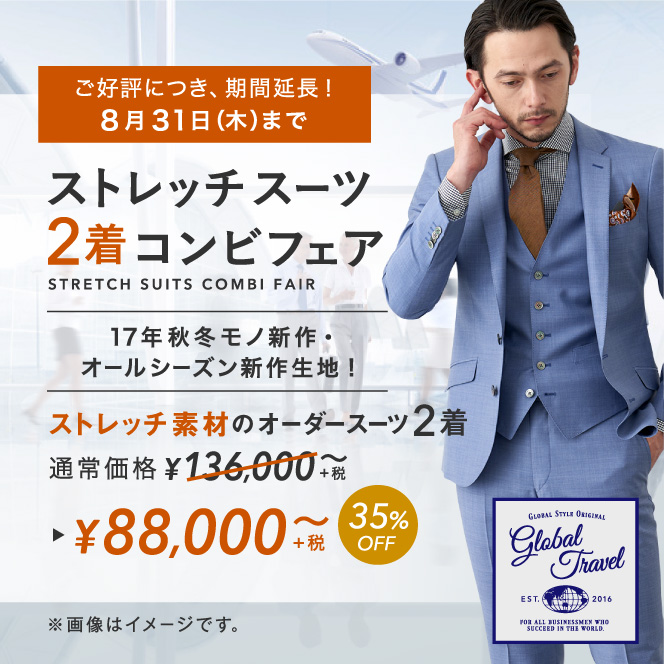 フェア情報のページです。グローバルスタイル(Global Style)では、本格オーダースーツが1着2万円台~!約5,000種類の生地をリーズナブルな価格でご用意しております。東京都・神奈川県(横浜)・埼玉県(大宮)・千葉県・静岡県・愛知県(名古屋)・大阪府(梅田/なんば)・奈良県・京都府・兵庫県(神戸)・広島県・福岡県(天神/博多/北九州)・北海道(札幌)・宮城県(仙台)・熊本県など全国40店舗に展開。