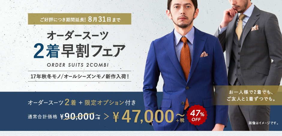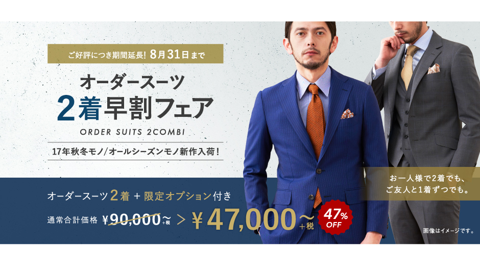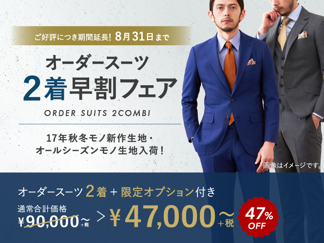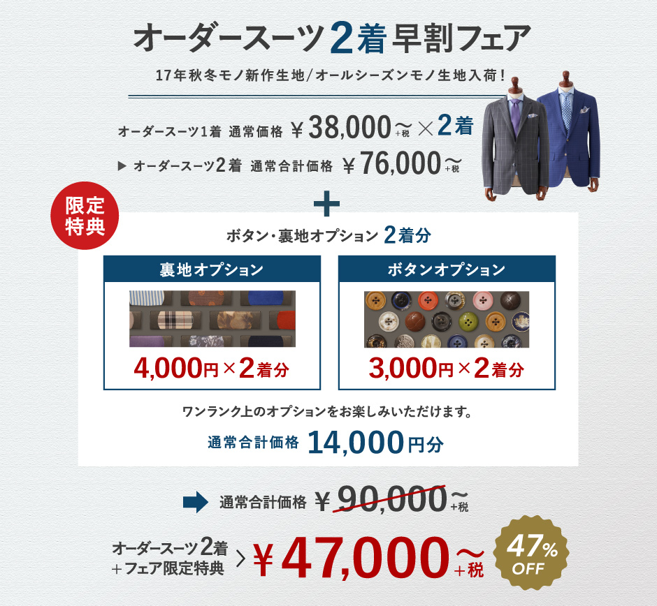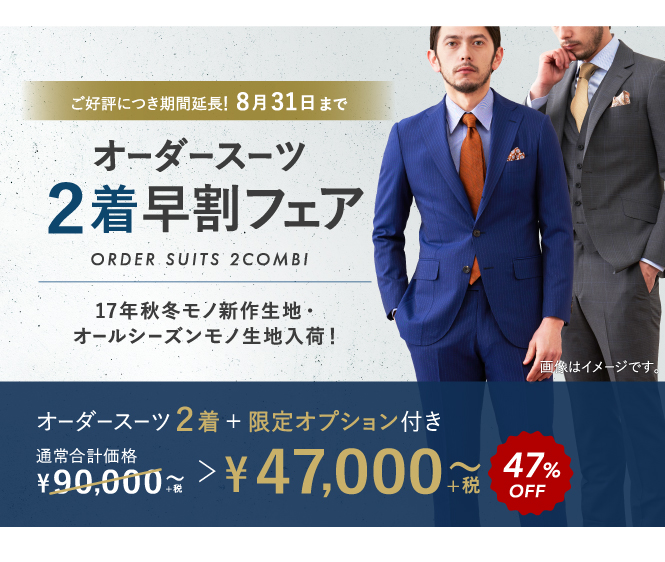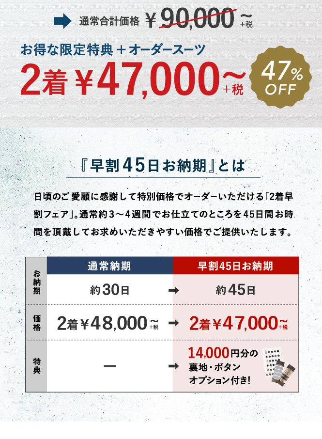 【早割】オーダースーツ2着47,000円~ 今だけ14,000円分の限定特典付き!