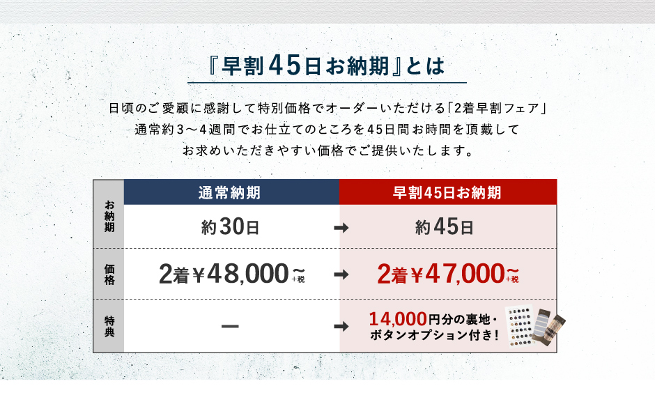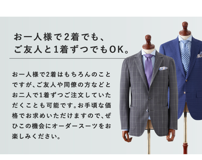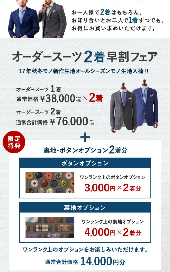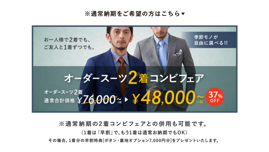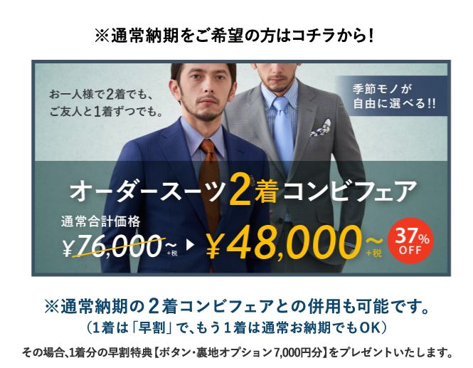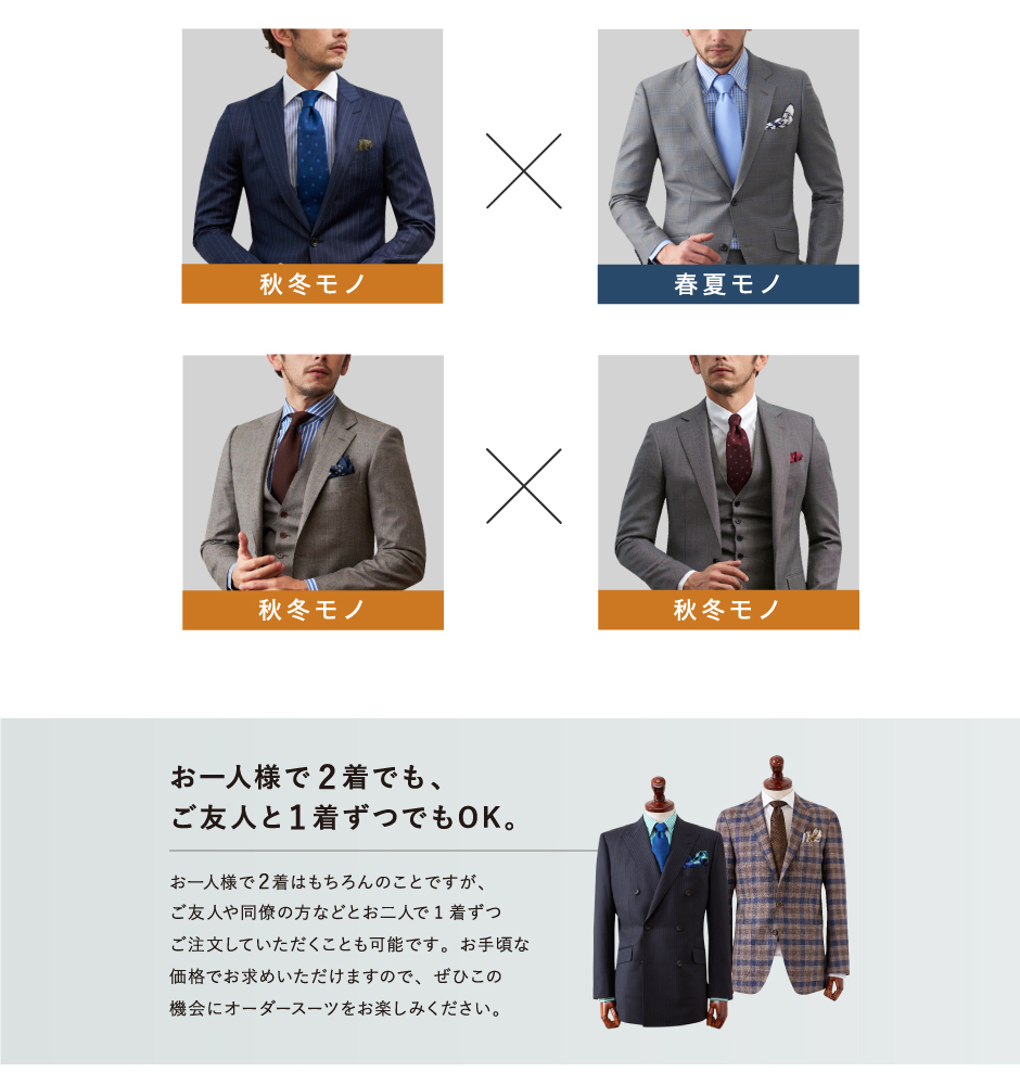 【早割】オーダースーツ2着47,000円~ 今だけ14,000円分の限定特典付き!
