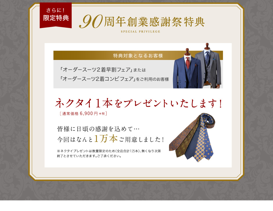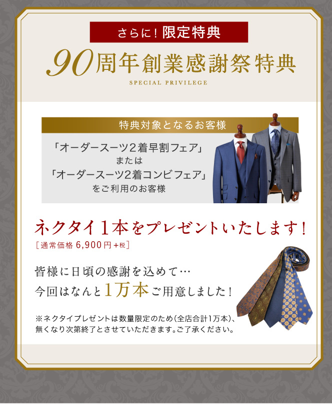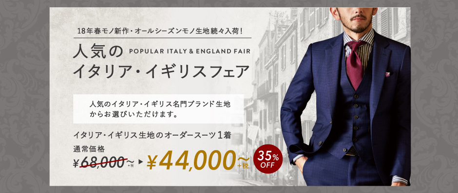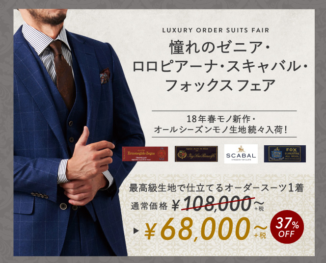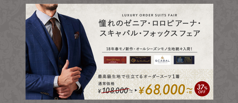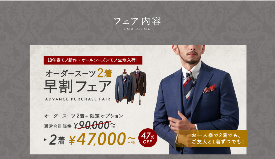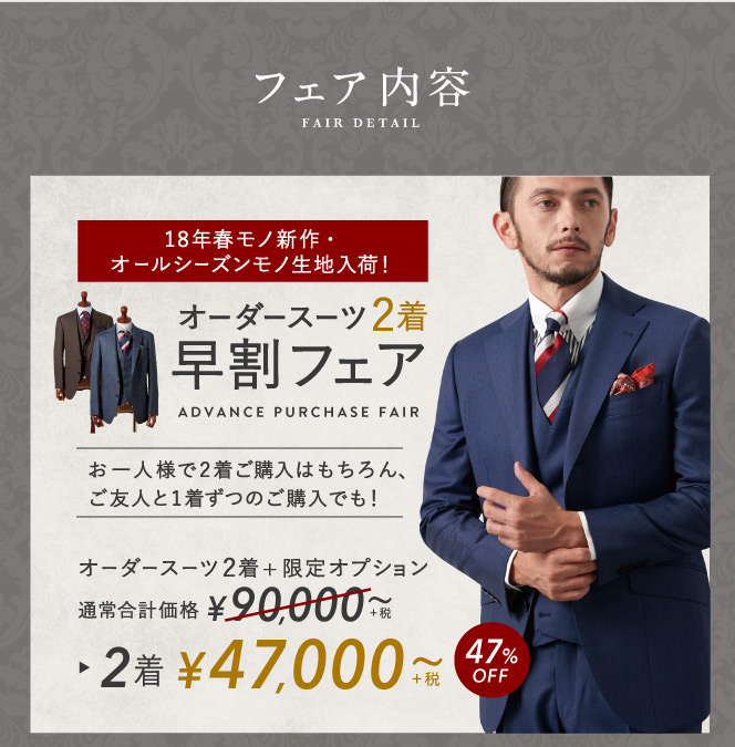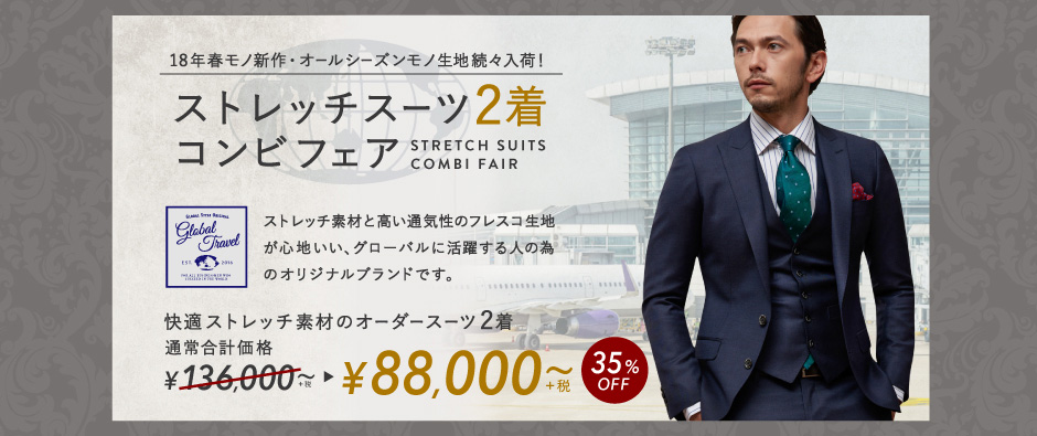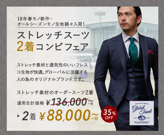 フェア情報のページです。グローバルスタイル(Global Style)では、本格オーダースーツが1着2万円台~!約5,000種類の生地をリーズナブルな価格でご用意しております。東京都・神奈川県(横浜)・埼玉県(大宮)・千葉県・静岡県・愛知県(名古屋)・大阪府(梅田/なんば)・奈良県・京都府・兵庫県(神戸)・広島県・福岡県(天神/博多/北九州)・北海道(札幌)・宮城県(仙台)・熊本県など全国40店舗に展開。