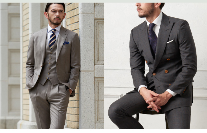 従来からある重厚な英国風仕立てを アレンジして薄めのパットやソフトな毛芯を用いています。 デザイン的にも高めの釦位置や強調された 裾のカッタウェイライン、スラントやチェンジポケットなど ブリテッシュスタイルの新しい息吹を体感して下さい。
