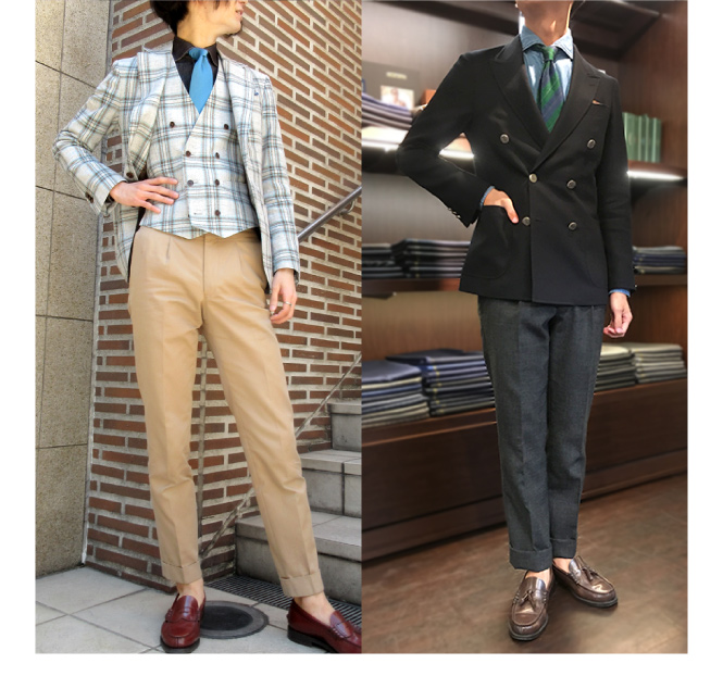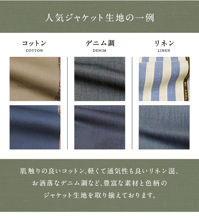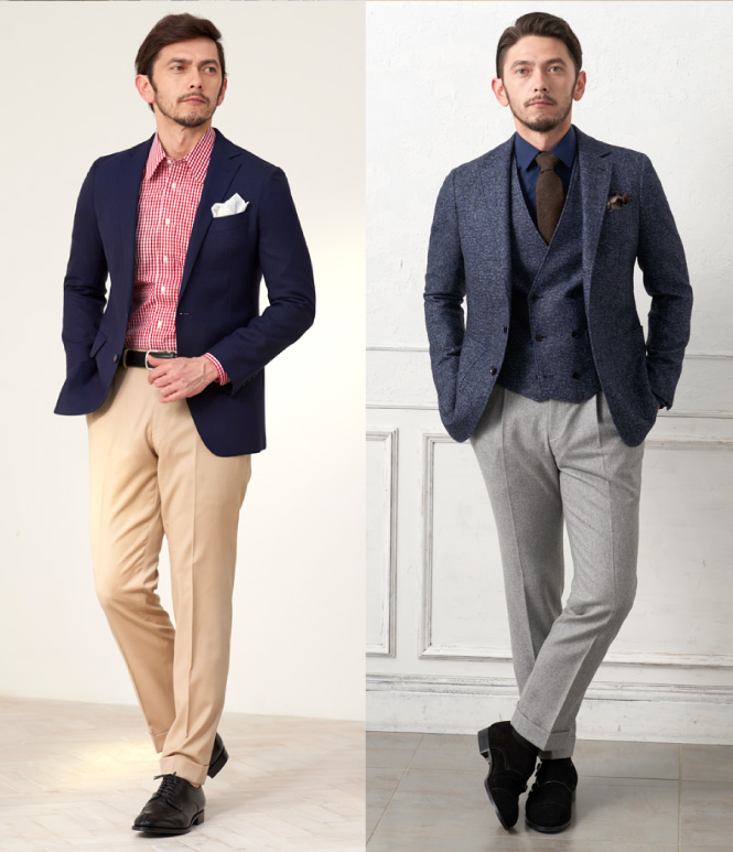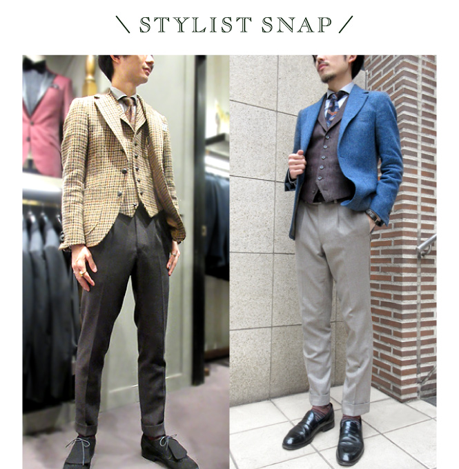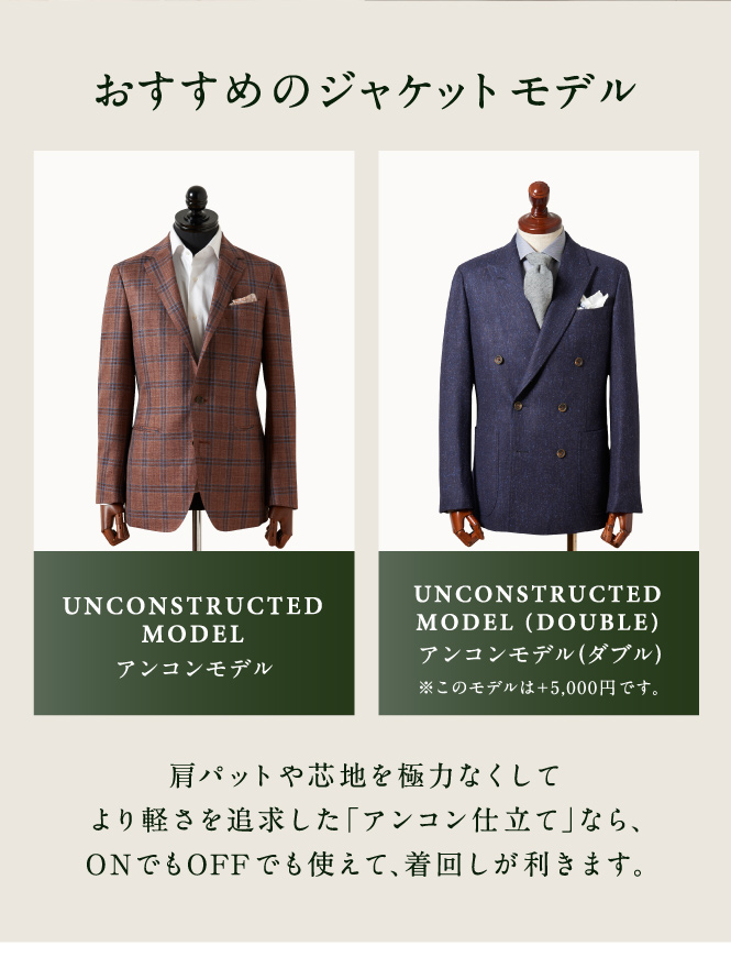 従来からある重厚な英国風仕立てを アレンジして薄めのパットやソフトな毛芯を用いています。 デザイン的にも高めの釦位置や強調された 裾のカッタウェイライン、スラントやチェンジポケットなど ブリテッシュスタイルの新しい息吹を体感して下さい。