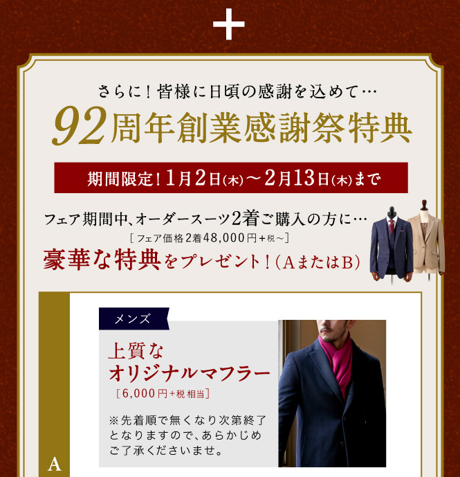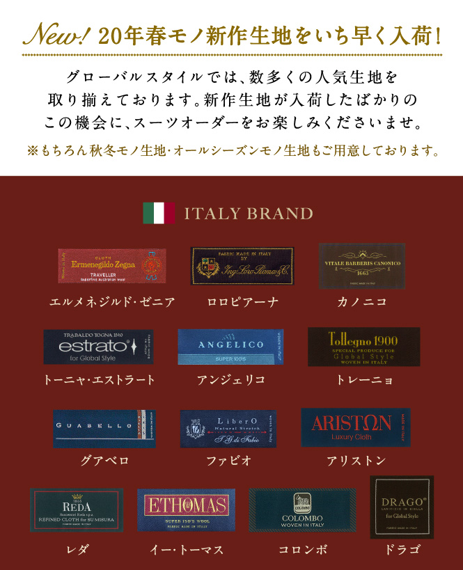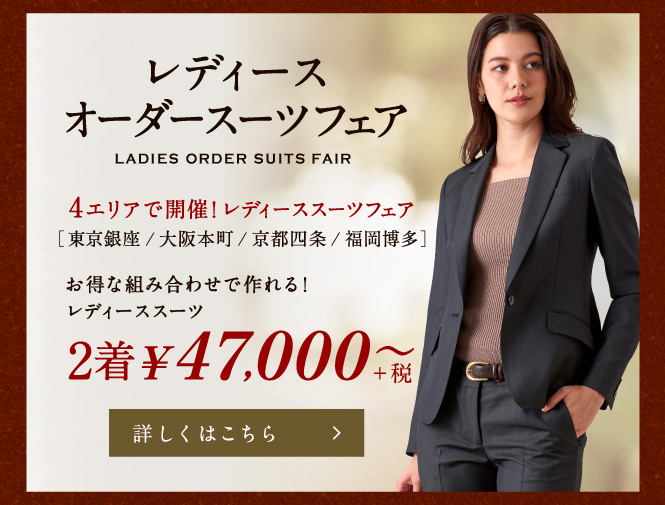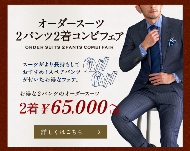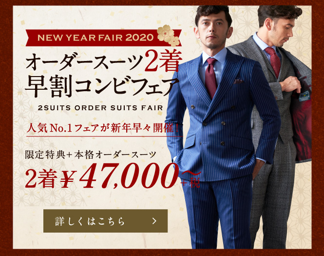 フェア情報のページです。グローバルスタイル(Global Style)では、本格オーダースーツが1着2万円台~!約5,000種類の生地をリーズナブルな価格でご用意しております。東京都・神奈川県(横浜)・埼玉県(大宮)・千葉県・静岡県・愛知県(名古屋)・大阪府(梅田/なんば)・奈良県・京都府・兵庫県(神戸)・広島県・福岡県(天神/博多/北九州)・北海道(札幌)・宮城県(仙台)・熊本県など全国40店舗に展開。
