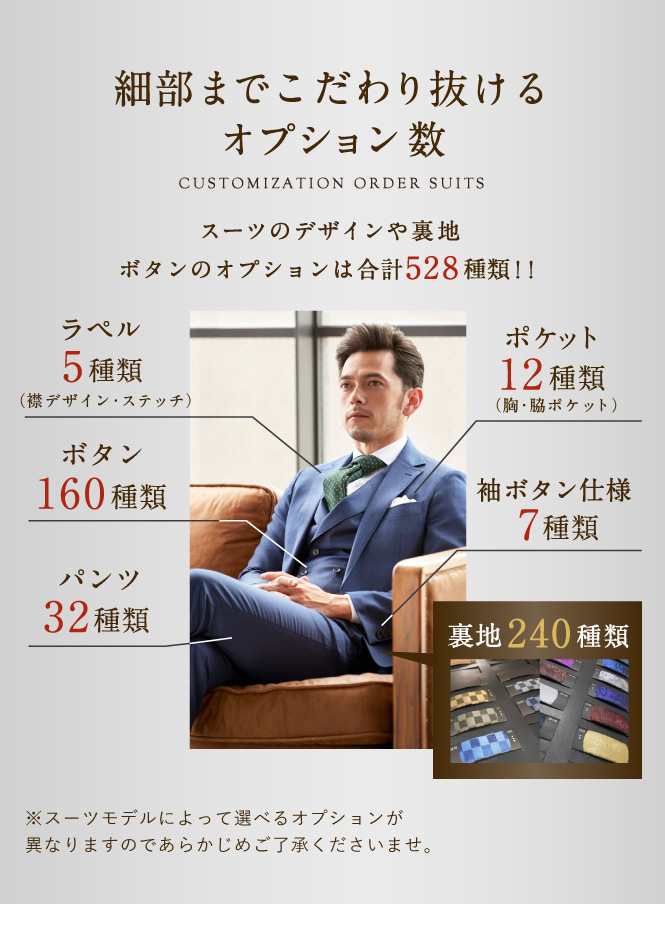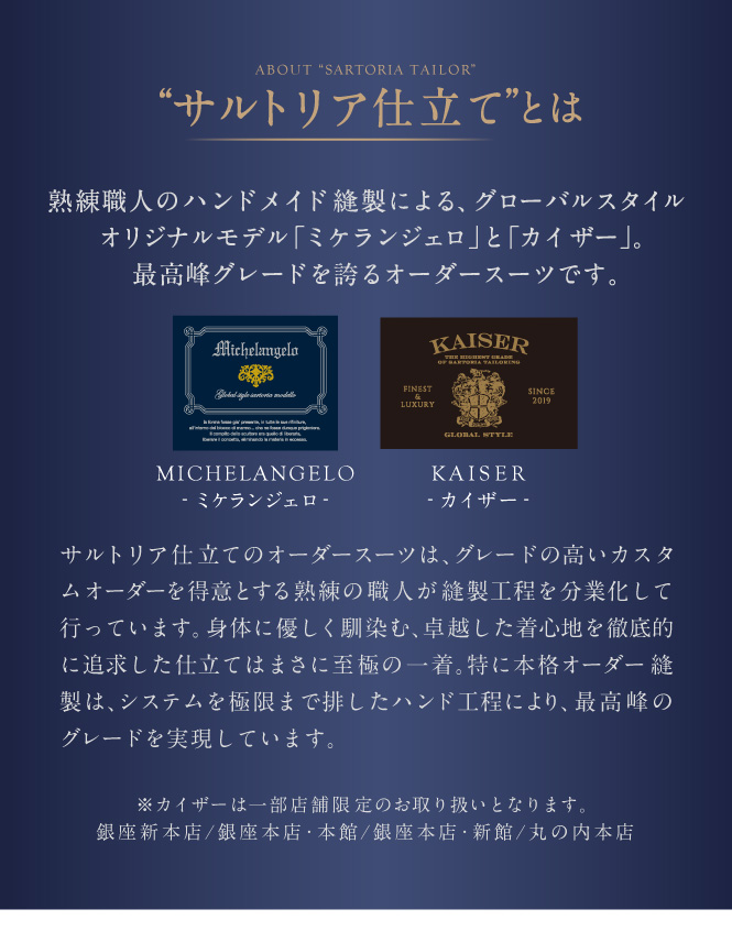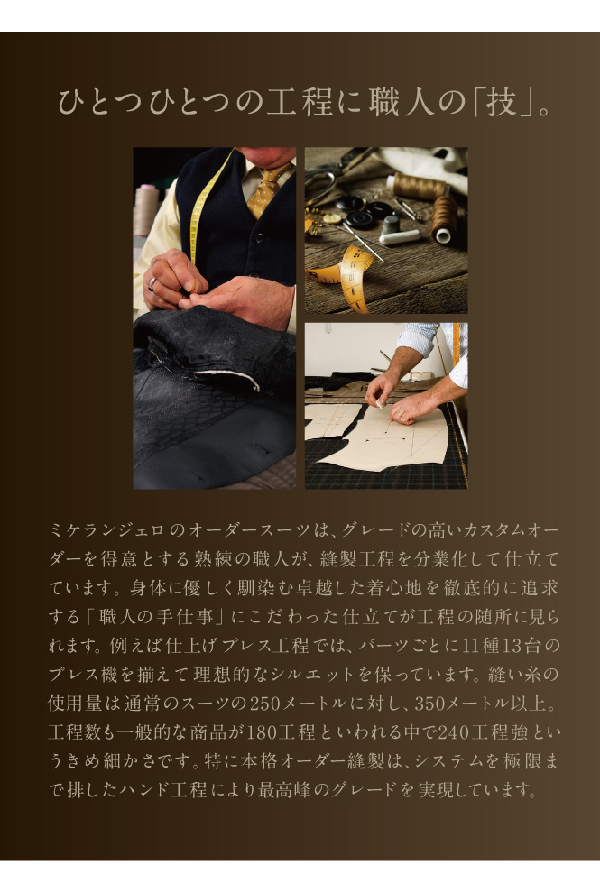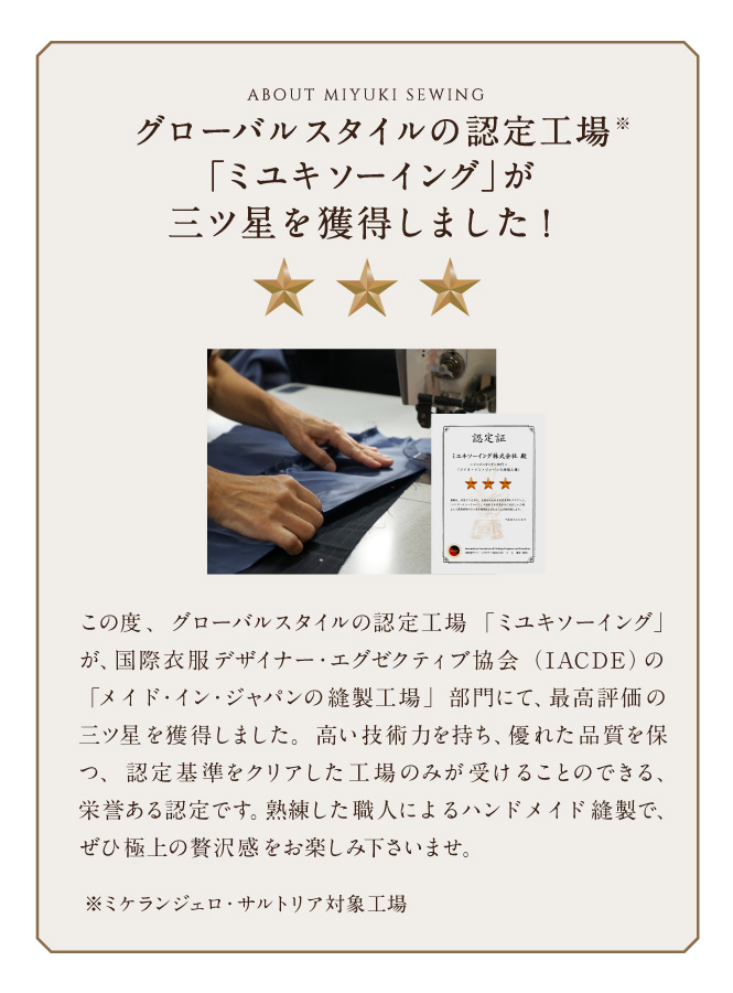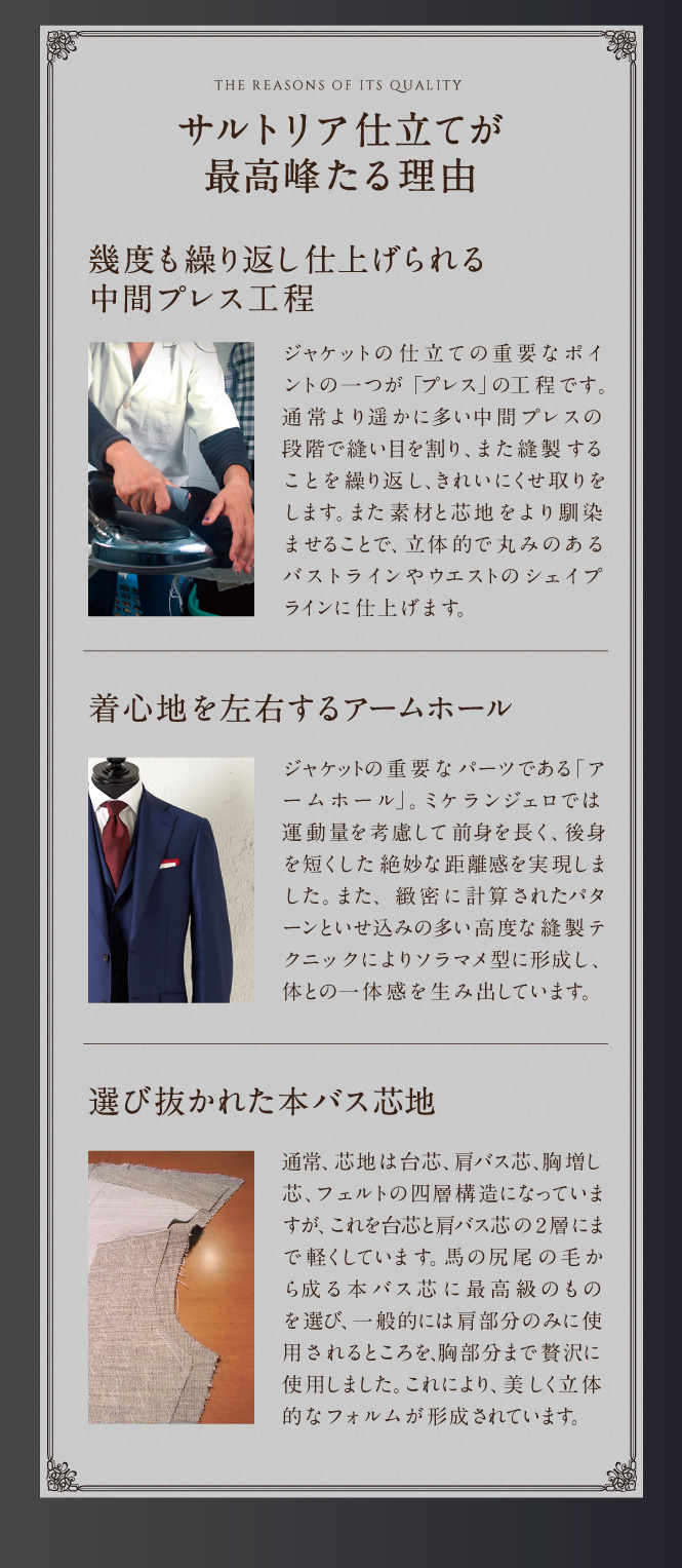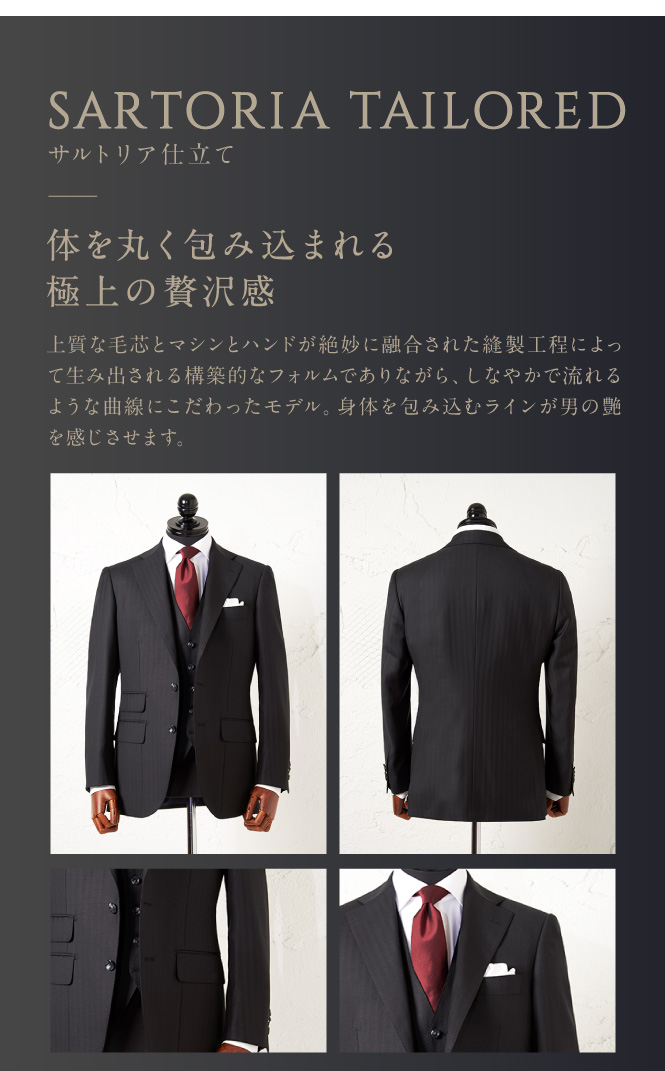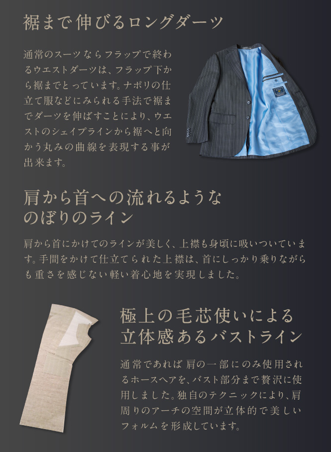 従来からある重厚な英国風仕立てを アレンジして薄めのパットやソフトな毛芯を用いています。 デザイン的にも高めの釦位置や強調された 裾のカッタウェイライン、スラントやチェンジポケットなど ブリテッシュスタイルの新しい息吹を体感して下さい。