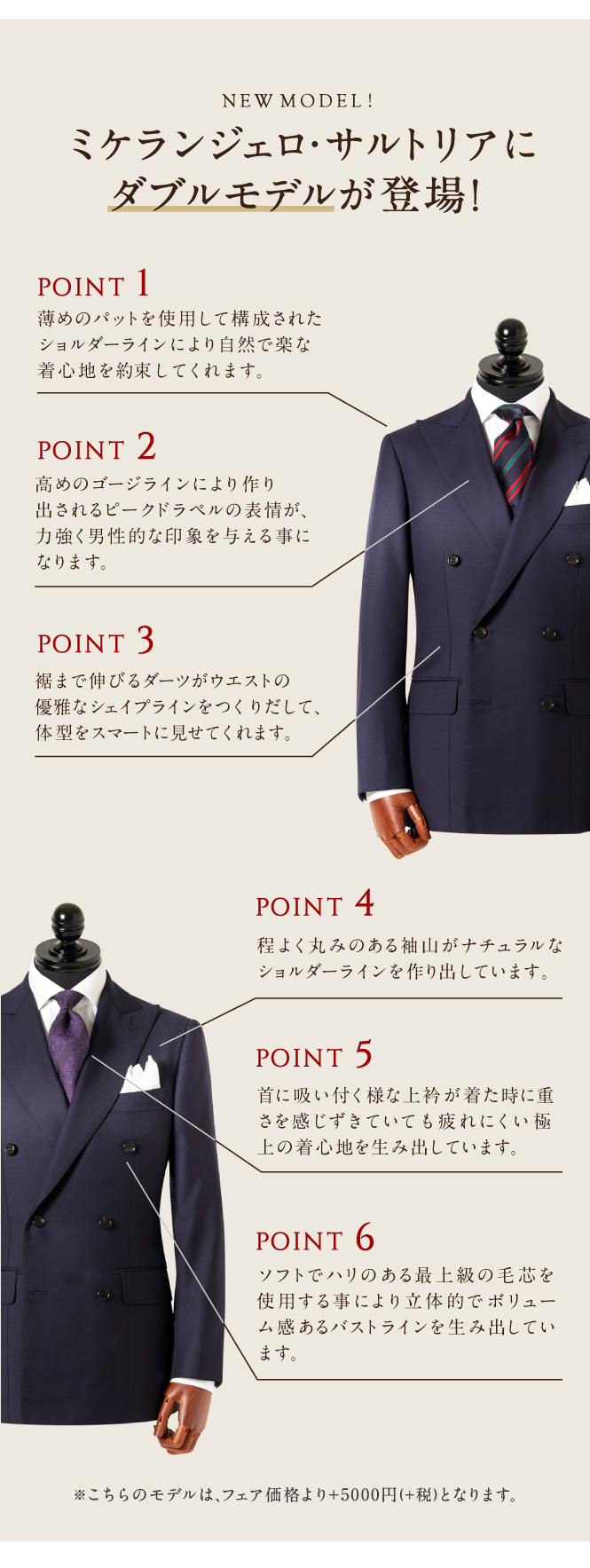 ハイゴージ、ハイシェイプなどクラシックなフォルムでありながら、従来より低めに設定された釦位置により深めのVゾーンを強調し、フロントのカッタウェイラインがエレガントさを表現しています。クラシックの部分とセクシーさを融合したモデルです。